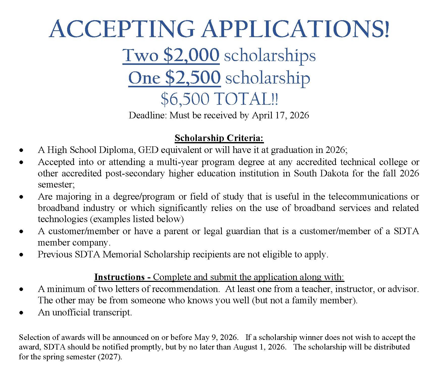 - Submit typed application via Mail to: South Dakota Telecommunications Association, PO Box 57, Pierre, SD 57501. Scholarship pdf form.